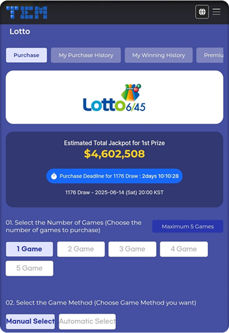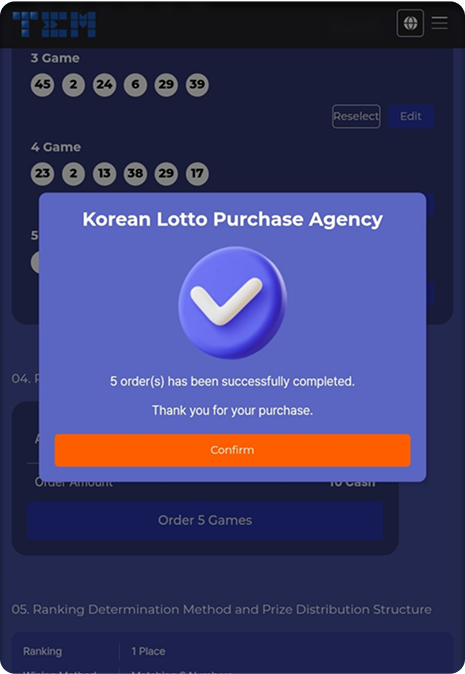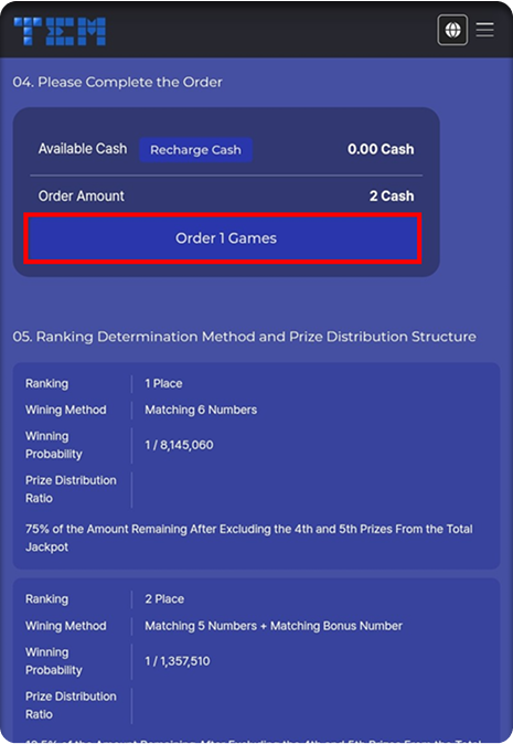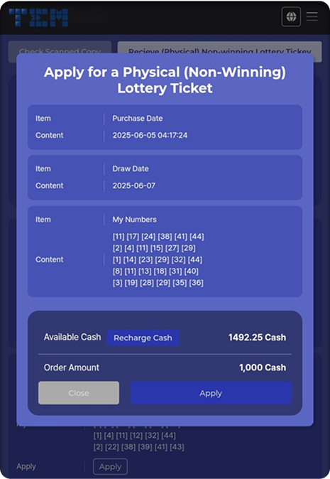 After reviewing your purchase history, if you do not have enough cash, click the [[Recharge Cash]] button to go to the cash top-up screen. Once the recharge is complete, click the [[Apply]] button to finalize your lottery purchase.